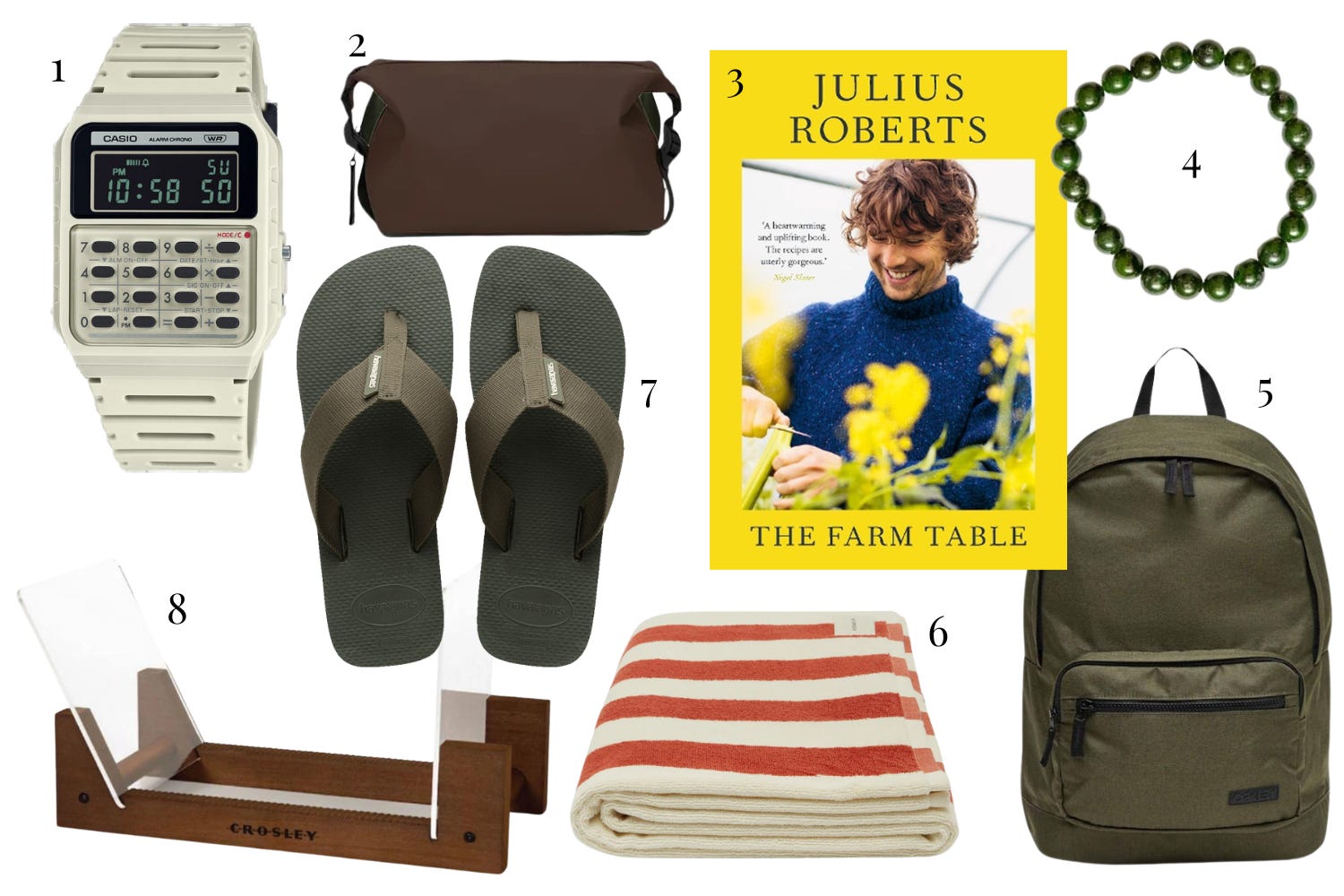1. Casio Digital Watch. 2. Rains Wash Bag. 3. The Farm Table by Julius Roberts. 4. Nephrite Jade Bead Bracelet. 5. Oakley Backpack. 6. Assembly Label Beach Towel. 7. Havaianas Flip Flops. 8. Crosley Record Display Stand.